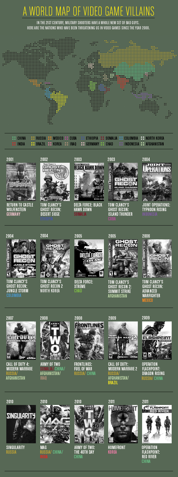 Le site internet Complex a répertorié vingt shooters game sortis depuis l’an 2000 et produit une carte démontrant la provenance de leurs vilains. La voici :