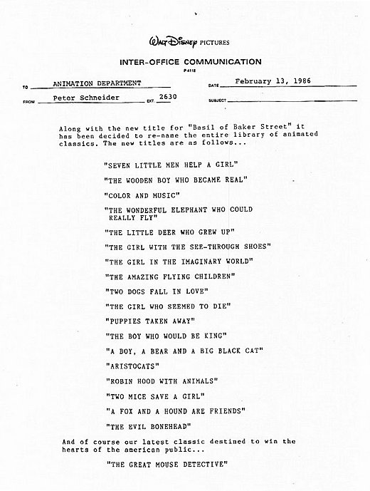 Au début de 1986, les dirigeants de Disney ont décidé de changer le titre de Basil of Baker Street, un long métrage alors en production, pour le plus simplet The Great Mouse Detective, ce qui ne fit aucunement plaisir à l’équipe de production. L’un de ces membres, l’animateur Ed Gombert, a signifié sa colère de façon humoristique : il a créé et fait circuler un faux mémo qui renommait, en ce style, tous les grands classiques de cet empire et qui avait l’apparence d’un véritable mémo. L’une de ces copies a fait alors son chemin jusqu’au LA Times, le voici :