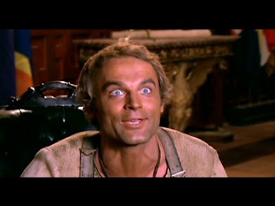 Quand le séminal Fistfull of dollars de Sergio Leone sorti en 1964, c’était évident pour tous qu’il était un transposition de fortune du Yojimbo de Kurosawa. Probablement pour cette raison, l’autre géniteur du genre fut laissé de coté assez rapidement. A fistfull of dollars, c’est aussi et surtout l’Arlequin, serviteur de deux maitres de Goldoni. L’ombre grimaçante de la Commedia d’ellarte était penchée depuis quelques temps sur le Western Spag. Plus que tout autre, c’est Terence Hill qui aura été son Arlequin; joueur de tour, acrobate ,arnaqueur, séducteur, faussement niais et au cœur de la lutte des classes.