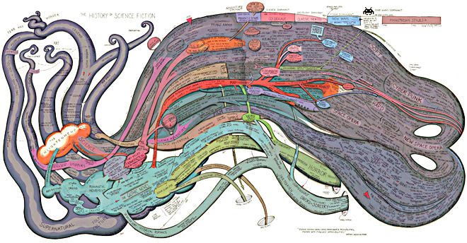 Voici une carte « anatomique » qui répertorie chronologiquement l’évolution de la science-fiction. Cette « créature » est l’oeuvre de Ward Shelley (un artiste qui n’a apparamment aucun lien de parenté avec une certaine Mary).